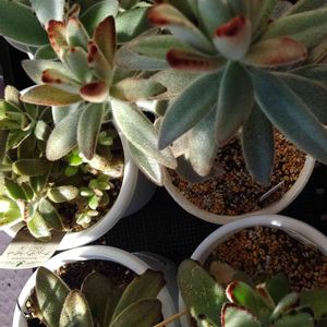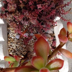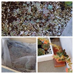 上 リトルミッシー 晩夏のころ 南側ではステッチ模様が 消えてしまいミドリンになってしまうので 北側の涼しい所で育ててました そのまま 北側で 冬 育てれないか 実験しています 育苗箱ごと ダンボール箱に入れ (左下)不織布を掛けて 冬越しをさせています 今日久しぶりに中をみましたら 思った以上に 増えていました😱🧐🧐🧐 薄日しか当たらないだろうに 不思議です 右下はハムシー 早くから花を三方に伸ばして咲かせ まぁお転婆さん💦 ここだけ春です🤭
