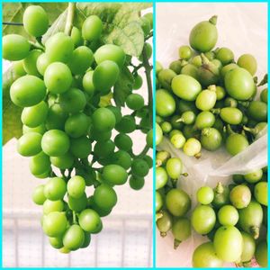 瀬戸ジャイアンツ✨ 花ぶるいとうどん粉病の影響で、房が少ししか残らなかったので、2回目のジベレリン処理は断念しました…ジベレリンが勿体なくて😓 瀬戸ジャイアンツは小さくてもちゃんと桃みたいな形してるんだ😳✨