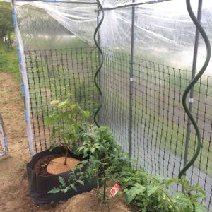 トマト螺旋支柱栽培などDIY 今月建築してみた家庭用ビニールハウス、5坪。DIYで猪鹿対策で柵を付けたのと、葡萄用天井ネット、トマト達向けに螺旋支柱を使用してみた。ジプシーの一員だったシャインマスカットを定植。ミニトマト アイコ、カゴメ大玉トマト、バジル、さつまいも シルクスィートを混植。狭いなりに空間利用して行けたらと思ったのだが、初螺旋支柱の便利さにビックリだった...今迄の苦労は何処へ⁈