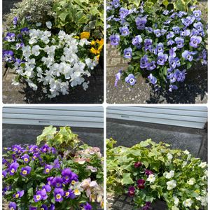 ビオラ、寄せ植え。 右下の白いビオラだけが、徒長してしまいました。 切り戻しした方が良いか、悩み中😅