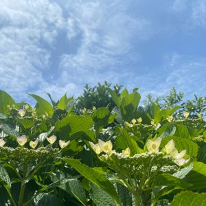 こんにちは☀️ 暑くなって来ました🥵 皆様に素敵💕な紫陽花を 見せていただいてますが、我が家の大昔からあるガクアジサイが、少し花びら(萼片)を 付けてきました。 一昨年の暮れに強剪定したので、昨年は殆ど咲かず。 今年は沢山咲きそうです。 青空🩵に向かって、気持ちよさそう*・゜゚・*:.。..。.:*