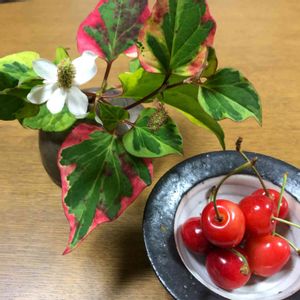 錦の日なので五色ドクダミと いただき物のサクランボ