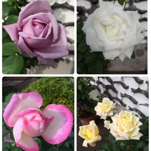 お寺で秋バラの紫香、ヨハネ・パウロ(白)モナコ、ピース(黄)