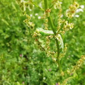 アヤモクメキリガの幼虫。 ハムハムもぐもぐ 一生懸命食べてました🐛 食べられていたのはギシギシ。 🦋大人になったら ガになるのに 幼虫は蝶になりそうですね。