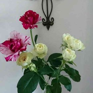 朝摘みのバラを飾ってみた😉 クロスとバラは 私の大切な宝物~✨✨✨ 素敵だよね~💕