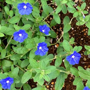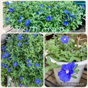 🌸アメリカンブルー🌸 エボルブルスの別名! 昔、日本に来た時に 名前が分からずに アメリカから来た青い花という単純なネーミングされました😅 暖地では越冬しますが、 寒冷地では一年草! 我が家は何とか 簡易温室で越冬してくれました❣️ 花の中央部が白い花模様になってるの、可愛よね😉