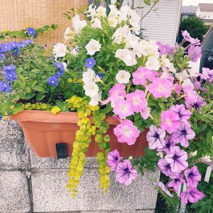ポスト横の寄せ植えがもりもりしてきました。暑い中よく頑張ってくれてます。 ペチュニア ショックウェーブ ココナッツ(白) ペチュニア VIVAシリーズ(薄紫)