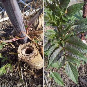 ダメだと思ってた 皇帝ダリア ふと見たら、新芽が出てました🌱🌱🌱 他の二本はダメ🙅🙅🙅 嬉しい😃