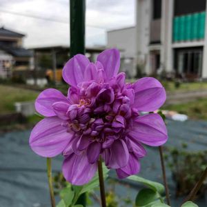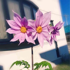 2.5m超えた 我が家の皇帝ダリア🌸 台風にまた負けるかな?! 去年、一昨年と台風にやられて ブロック塀の所で折れました😑 紐で引っ張って、矯正 支柱とか出来ないので💦 どうにか頑張ってほしいな‼️