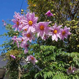 おはようございます♫ 以前、タニカノさんからいただいた 皇帝ダリア、初めてお花🌸が咲きました。 ひまわりのように、 背丈くらいの高いところに 輪になって咲いてます🌸🌸🌸 まだ後ろに、つぼみが5個あります。 昨日は、北風が強く、 倒れないか心配したけど 傾いて咲いてます∗︎˚(* ˃̤൬˂̤ *)˚∗︎ 支柱を立てないといけないですネ。 ☸︎˳*✦︎∗︎˚೫˳♡︎˳೫˚∗︎✦︎*˳☸︎
