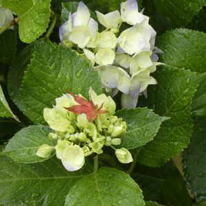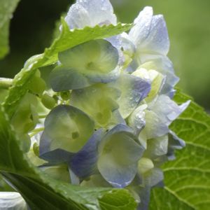 「アジサイ」 先ほど 小雨🌂の中 近所のお寺へ📷を持って アジサイの撮影。 モミジの葉は何処からやって来たのだろうか。 🏷青い花で梅雨景色2023 🏷咲き始めのお花たち
