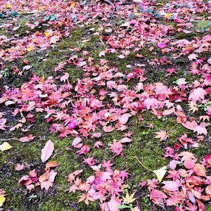 尼崎市上坂部西公園 苔の上に紅葉した落葉がすてきです。 モミジ、トウカエデ、イチョウなど 画像上部の青い葉は原種のシクラメンです。