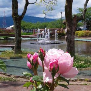 =🌹薔薇シリーズ🌹⑫= <バラ公園いこいの広場> 後方に見えるのが池田の山並み⛰️⛰️⛰️ この噴水広場は浅いので、お天気がいいと、子供達の水遊びにはもってこいのところですヾ ^_^♪✨👏🏻💫😍💐💭🌹⛲🍃🌱🌹💫