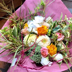 花束💐組みました。 京都artisan flower Worksの小谷佑輔さんのレッスン受けて来て。 レッスンのアレンジは崩して。 その花で、花束組み直しました。 ヤマゴボウやケイトウが入ってて、秋っぽいです。