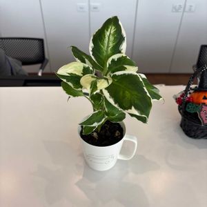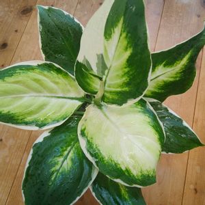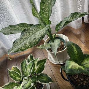 ディフェンバキア・クールビューティー 6月26日(水)親株の方を植え替えました。 写真2枚めは植え替え前。 枝が暴れて邪魔なので少し深植えして真ん中に寄せる感じにしたのでちょっとしばらく見た目悪いです。 鉢容量2.2リットルから1.8リットルにサイズダウン。 土は無機質です。(硬質赤玉土、硬質鹿沼土、軽石小粒、ゼオライト、パーライト)