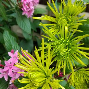 レスキューして4年目を迎えたカクテルマム💚 この子も過去picを遡ってみると50円で購入したようです😆✌️ この色と繊細な花弁😍 スパイダー咲きと言うそうです(*^^*) 後景のペンタスさんもまだまだ元気いっぱいです😊💪