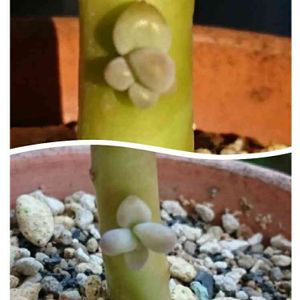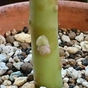 新芽成長の写真を撮ろうとして今気づいたんだけど、別に茎挿ししてた株からなんか出てたΣ(´□`;) 朝の雫付きで、ほんわかしたので今日はこいつの写真を載せようと思う。ちょっとエロいし。