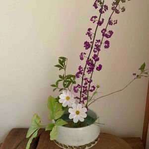 芍薬の葉 ドウダンツツジ コムラサキ コスモス🌸 連投失礼します🙏コムラサキが長いかな? これは、迷いなく出来ました。コスモスだけ一輪にしようか少し考えました。 撮影は飾る場所と別です。