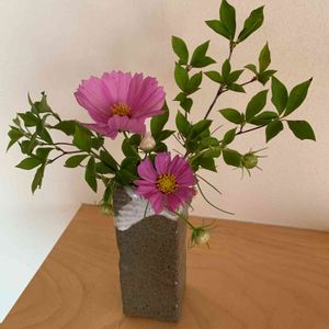コスモス ドウダンツツジ 残った花材でいれました。家中花だらけで飾る場所思案中🤓 もっと小さい子をお風呂にも飾ってますが、ついに風呂にまで花飾りだしたで👀娘談😅