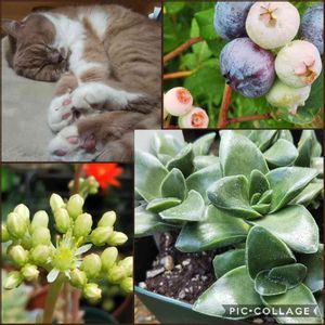 ↖️本日も開催中、肉球集会🐾🐾Zzzzz… ↗️目玉オヤジと別種ブルーベリー 「お前この前まで同じ大きさだったはず・・・・・」 ↙️セダム カメレオンのお花🌼(と、ツボミ) 結構、花弁が多いね ↘️HCによくある横長タグの付いたナゾ多肉 タグには紀ノ川❗って これ、紀ノ川には見えないんですが・・・・・徒長だとしてもこんな感じになります~?(?ω?) 結局狩ってるんですけどね クラッスラ好きですから