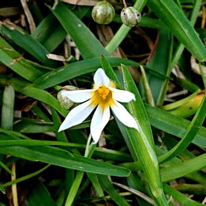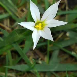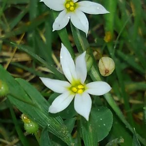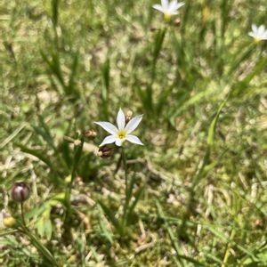 セッカニワゼキショウ(雪花庭石菖)アヤメ科ニワゼキショウ属 山の公園の広場にセッカニワゼキショウが群生してました。 先日出会ったおば様に教えていただき初めて 見ることが出来ました。 真っ白でとっても綺麗でした。 和名は花が白いため雪花とつけられ、小さいためコニワゼキショウとも呼ばれます。北アメリカ原産とされていますが、学名は確定していないそうです。ニワゼキショウより草丈が低く、花被片は白色、先が次第に細くなって尖り、筋は中央に1本だけあります。花被片の基部は合着して黄色。雄しべは3個、花冠筒部から突き出ません。果実は直径3.5~4㎜のほぼ球形です。 🏷 白い水曜日♡