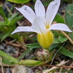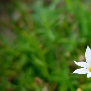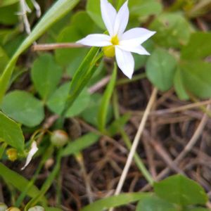 1年前名前を教えていただきました😊 アヤメ科ニワゼキショウ属 北アメリカ原産とされている。 帰化植物状態になりつつあり分類上の学名は確定されていない。 花弁は白色、先が次第に細くなって尖り、スジは中央に1本だけある。 基部は合着して黄色。 草丈3㎝~10㎝。多年草。 受粉できなかった場合、日没を待たずすぐに萎み一旦閉じて受粉できる迄、数日間開花を続ける。 1年前、テニスコート6面分くらいの広い芝生にこれでもかと咲いていたこの花に会いたくて少し遠出しました。 なんとびっくり😵あちこち探しても、☘️🍀が群生していてどこにも見つけられません。 諦めて、100mくらい離れた小高い丘で休憩していてこの株を見つけました😂 こもれびの入るやや湿った場所。 種が飛んで来たのか、靴の裏で運ばれたのか? この一株に会えて良かった😊 あれ程広がっていた小さな白い花。不思議、ふしぎ‼️ もしかしてセイタカアワダチソウにもあるアレロパシー(他感作用)で発芽障害をおこした❓🤔 去年私が見てから全て消え失せた理由を教えて下さい。 1年前迄の開花状況はわかりません。