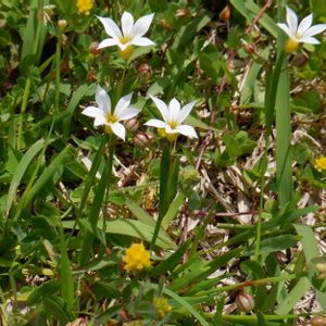 雪花ニワゼキショウ アヤメ科 ニワゼキショウ属 北アメリカ原産 ニワゼキショウやオオニワゼキショウはよく見るのけどこの子には気づきもしませんでした。背丈のも小さめで花被片の元も黄色のみ。