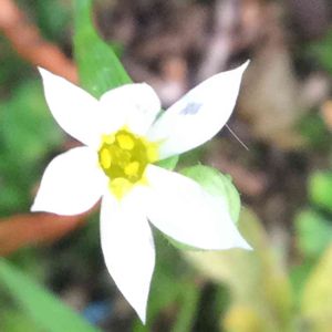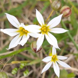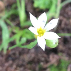 セッカニワゼキショウ(雪花庭石菖) アヤメ科ニワゼキショウ属 中々出会えない物と思っていましたが そんな心配はいりませんでした 多摩川の土手にニワゼキショウと隣り合わせて 驚くほど沢山咲いていました 北アメリカ原産 草丈3~5cm 花被片は白、先が細くなって尖り 中央n黄色の筋が一本ある 基部は合着して黄色 雄蕊は3個 果実は3.5~4mmの球形 花期は5~7月