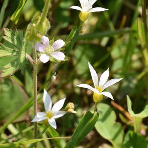 ✤セッカニワゼキショウ(雪花庭石菖)✤ アヤメ科の多年草 別名:コニワゼキショウ(小庭石菖) 花期 :5~7月 北アメリカ原産の帰化植物。ニワゼキショウより草丈が低い。花は白、花弁が6枚に分かれており、先が次第に細くなり尖る。筋は1本だけ。雄蕊は3個、花冠筒部から突き出ない。 普通のニワゼキショウに紛れて咲いてました🤗 しれ〜っと、ニワゼキショウになりすましてる、アメリカフウロも一緒に記念撮影📷パシャリ 皆さん、良い一日をお過ごし下さい♫ 2022.GW 都立水元公園にて📷
