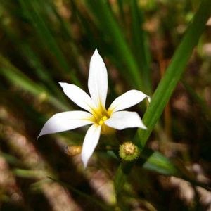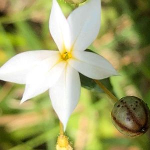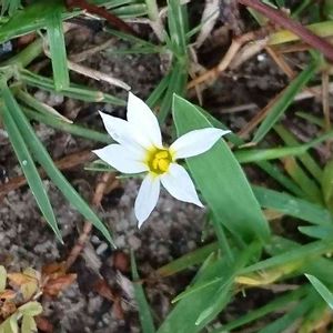 とても小さい白いニワゼキショウ。 漢字では、雪花庭石菖。 中心部は黄色。