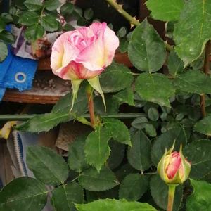 おはようこざいます«٩(*´ ꒳ `*)۶» 昨日は台風の影響で長い時間雨が降っていましたけれど、今朝は晴天。 気温も落ち着いていて気持ちいいです( ˶ˆ꒳ˆ˵ ) これから陽が高くなるにつれて暑くなるのでしょうね(×∀︎×๑ ) 鉢植えのバラさんたちにはほとんど被害が出なくてひと安心です( ⸝⸝•。•⸝⸝ )ホッ でも前回の台風8号のときにやられたブラッシュノアゼットさんの枝がまた株元から折れちゃってました|ω-`*)シュン 立派だったブラッシュノアゼットさんの姿も今ではスリムに貧素になってしまいました。 たくさん蕾をつけていたのに残念です(´•̥ω•̥`) そんな日の朝のバラさんたちです(✿︎´ ꒳ ` )♡︎ 雨にうたれてうつむいていたマルク・シャガールさん、白い子は細い花枝で強い風に耐えてくださったシュシュさん。 赤いバラさんの上の方は今年新苗でお迎えして育てているベルデセゴサさん。 花びらの裏が白いお洒落なバラさんです(*ฅ́˘ฅ̀*)♡︎ そして下の方はザ・スクワイアさんです。 淡い彩に赤いバラさんを中心にまとめてみました(ㆁᴗㆁ✿︎)エヘ 台風の後で湿度も高くて気温も上がると思いますので、熱中症にはお気をつけくださいませ( ⁎ᵕᴗᵕ⁎ )♡ 今日も素敵な一日をฅ( •ω• ฅ)ガオ-♡