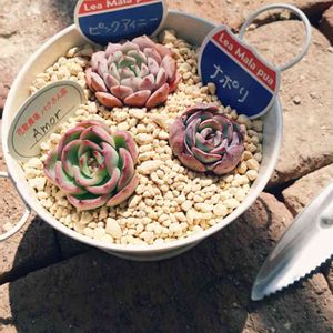 こんにちは( ´ ▽ ` )ノ 毎日娘と多肉イジリしてる(笑) 少しずつですが植え替え中(^-^)/ でっ!今月はもう買わない‼︎って決めつつ楽天市場で韓国苗を5苗も買っちゃいました(笑)ダメだ(笑)多肉狩り病です( ̄▽ ̄)オマケ⁉︎で鉢も入れてくれてた♡メチャ可愛いー( ´ ▽ ` )ノ 来月また買おー(笑)