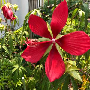 近所のスーパーにある花壇。割と大きな花。花びらが離れてる感じが不思議でまじまじと見てしまいます。南国っぽい印象ですが…どなたかご存知でしょうか?