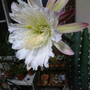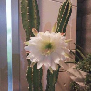 最近柱サボテンに花が咲いた🌼 夜になって開花✨一晩だけ咲くらしい。 夜に白い大きな花が咲くのはびっくりするけど綺麗や✨