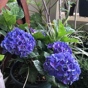 おはようございます。挿し木で増やしたピンクとブルーの紫陽花見頃になったので玄関前に持って来ました。