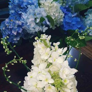 2020*6*12 【紫陽花、柏葉アジサイ、オリズルランの花】 ☔️にうたれて 皆さん うなだれてしまいました✨ 柏葉アジサイは、 下の茶色くなった所をカット✂️して オリズルランの花を 入れて 少し アレンジ しました✨ 又、しばらく 楽しめます👩🌸