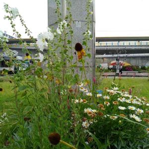 駅前の花壇 白のタチアオイでしょうか⁉️