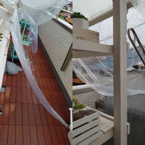 今更ながら雨と日光対策☀️ 今まで遮光シートかけていて、大雨の時はその上にとりあえず子供が使わなくなったレジャーシートかけていただけなので…🙄 ニトリのテーブルクロスで遮光面はクリアになるといいなぁ🙄