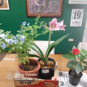 お昼食材買いながら店内花卉こーなーへ 有りました👀 花友さんと同じシロスジアマリリスちゃん🙌 他にはルリマツリ 持っていますが花色が若干薄い感じでした。 濃い色が手に入りました。 後はニューギニアインパチェンス 楽しめます♪