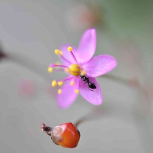 【ハゼラン】 花径が5mm位の小さな花に蟻がやってきていました。 ハゼランは熱帯アメリカ原産の帰化植物。栽培用に導入されたものが道ばたなどに野化してます。ハゼランは、ふくらんだつぼみがつぎつぎとはぜるように開花する様子を表現した名前のようです。昼過ぎ、三時頃から夕方まで花を開くところから、三時花(サンジカ)あるいは三時草(サンジソウ)ともよばれているとのことです。