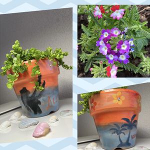 バーベナ(美女桜)💕 小花が集まって傘のような輪の形に連なる 可愛らしいお花💕 予言や呪術の力を高める効果で媚薬として用いられている魔女🧙♀️の薬草😁 だそうです😁 ピンク色は家族の和合💕🌿 紫色は私はあなたに同情します💜 輪になる花姿は人の結びつきのシンボル😍 職場の先輩が花壇に植えてくれました💕 🌿ぺぺロミア イザベラ 成長はゆっくりですが垂れ下がって きましたよ。 日に当て過ぎたかな〰︎❓ ちょっと元気なくなっているので、ひと回り大きな🪴鉢にペイントして植え替えてみました。 夕焼け浜辺のフラガールです🤗 素敵な午後を🎵🍀💕