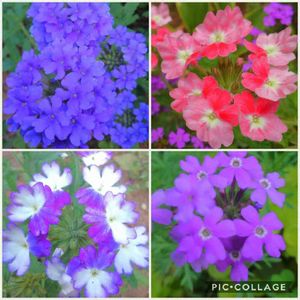 おはようございます(*^^*) 庭で咲いているバーベナ達です 今年 左下のパティシェ ブルー&ホワイトをお迎えしました😃🌸