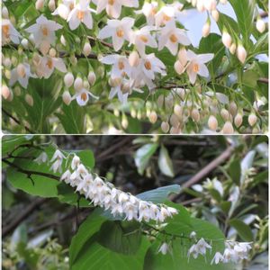 エゴノキ(エゴノキ科エゴノキ属) エゴノキのお花がたくさん咲き出しました。 小さな白い花を枝から下げるように咲かせる姿が可愛いです。 エゴノキは日本全土に分布する落葉樹です。5月から6月にかけて小枝の先に短い総状花序を出し、釣り鐘状の白い花を下向きにつけ、秋には卵形の果実が熟します。樹形は野趣に富むことから、雑木の庭の植栽材料としてよく利用されるようになりました。花や葉に変異のあるものが見られ、ホソバエゴノキ、テリハエゴノキなどの変種があるほか、萼がピンク色のベニガクエゴノキや小花のヒメエゴノキなどは品種として扱われています。古くから親しまれてきた万葉植物の一つで、和名の由来は、果皮が有毒でえぐみがあることによります。昔はこの果実をすりつぶして川に流す漁法が行われていたといいます 4⃣5⃣ ハクウンボク(白雲木 )エゴノキ科エゴノキ属 10mくらいある、ハクウンボクの木 お花はエゴノキに似ています。 高い所にたくさんのお花が咲いていました。 私のスマホではこれくらいしか撮れません。 北海道~九州に分布するエゴノキ科の落葉樹。山地に自生し、稀に庭木として植栽されてます。初夏に咲くボリュームのある花を白雲に見立て、ハクウンボク(白雲木)と名付けられました。日本以外では朝鮮半島や中国に分布。 🏷 白い貴婦人✨