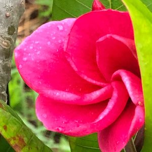 開いたショッキングピンクの子を写真に撮ろうと早起きしたのに、雨❣️ みんなが起き出す頃、やっと雨が上がって写真撮影。 雨上がりということもあり、うちのアマガエルさんもプルメリアの葉っぱの上でのんびりしてました。 ❣️❣️❣️上がって空を見上げたら、あ!あんな高い所に! 早速脚立を持ってきて写真撮影。 来年は取り木だねと言っていた2m超えの大きな子に花が咲いてました。 薄いピンクに濃いピンクの縁、この子も綺麗😍