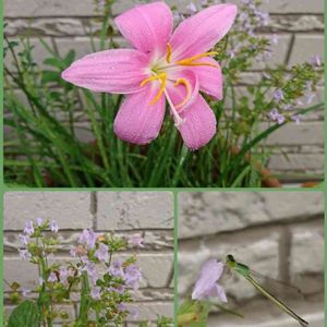 ゼフィランサスの花が咲きました花💠 こぼれた種から同じ鉢に生えてきたオレガノ・ハイライトの花には、小さくて可愛いトンボが飛んできました😃🎶 (上手くピントが合いませんでした😅)