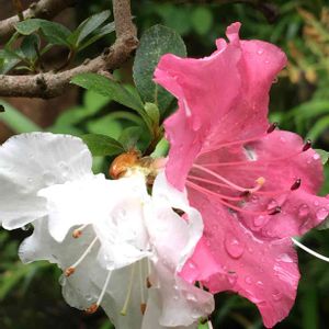 6月30日のツツジ。サツキではと教えていただきました。 昨夜の強い雨で散ったと思っていたのですが、まだ咲いてくれてました。 雨粒をいっぱいつけて、少し重たそうに俯いてました。最後のツツジなので記念に撮りました。