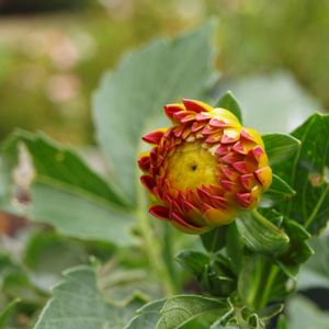 ダリアの蕾が開いてきました。葉っぱは穴だらけ。