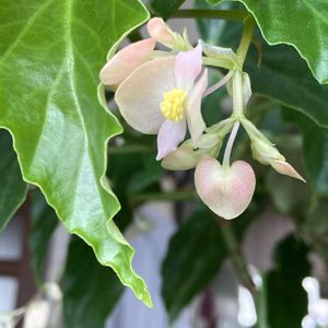 木立ベゴニア ハナガスミ 去年 お迎えして 〰️ 冬は室内 寒さで 葉色も悪く弱っていたけど 温度が保てると 一気に元気 鉢増しで 花付きもいい 窓側の日当たり良い枝🎀ピンク花