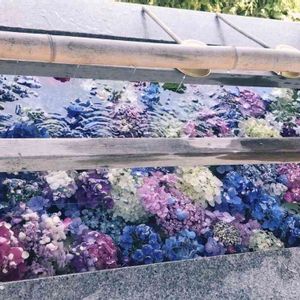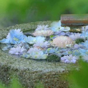 🎶中旬、行田八幡神社に 健康祈願のお参り (連投3枚です) 花手水 3鉢の様子です♪ こちら水色系、優しい色でしたよ〜(*ˊᵕˋ*) 3mくらい離れて 木の葉の隙間から🌿 怪し~い デジカメおばさんをしましたぁ🤭
