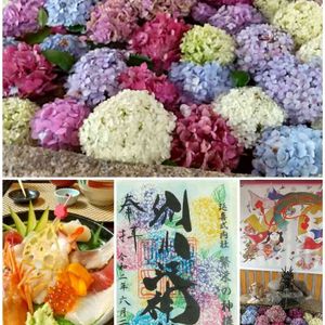 梅雨☂️💦を楽しみたいと🚙💨✨ 名古屋の とある神社⛩️ アジサイでいっぱいの花手水💜💙💗 手水舎に今の時期だけアジサイを浮かべています 限定の御朱印も頂きました\(^o^)/ 行きつけのお寿司屋さんで食べた海鮮丼も😋👌 雨に降られず快適でした🎵